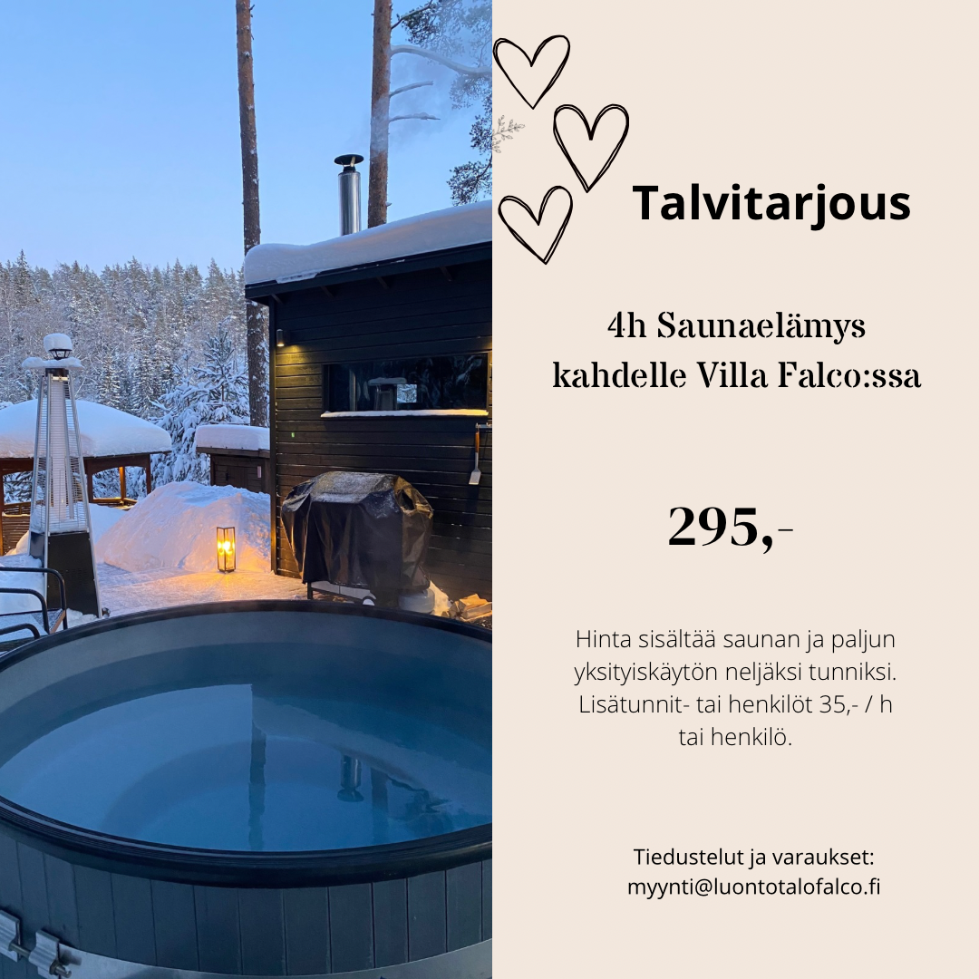 Villa Falco on yksityinen glamping- tyylinen moderni villa saunalla ja majoituksella keskellä Nuuksion kansallispuistoa, Espoossa. Nauti perinteisestä suomalaisesta puusaunasta ja pulahda paljuun terassilla luonnon ympäröimänä. Rauhaisa luontokohde löytyy vain 30 minuutin ajomatkan päästä Helsingistä. Huomioithan, ettei Villa Falcolla ole henkilökuntaa. Palju lämmitetään valmiiksi sisäänkirjautumisajan mukaan, mutta tulen ylläpitäminen on asiakkaan vastuulla.